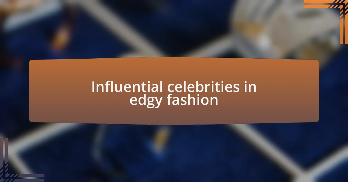 When I think about influential celebrities in edgy fashion, I immediately picture icons like Rihanna and Billie Eilish. They’re not afraid to push boundaries, flaunting unique looks that often include unexpected combinations, such as oversized silhouettes paired with daring accessories. I remember scrolling through social media and being struck by how a single outfit can redefine what we associate with boldness in style—doesn’t it make you yearn for that kind of creative freedom?